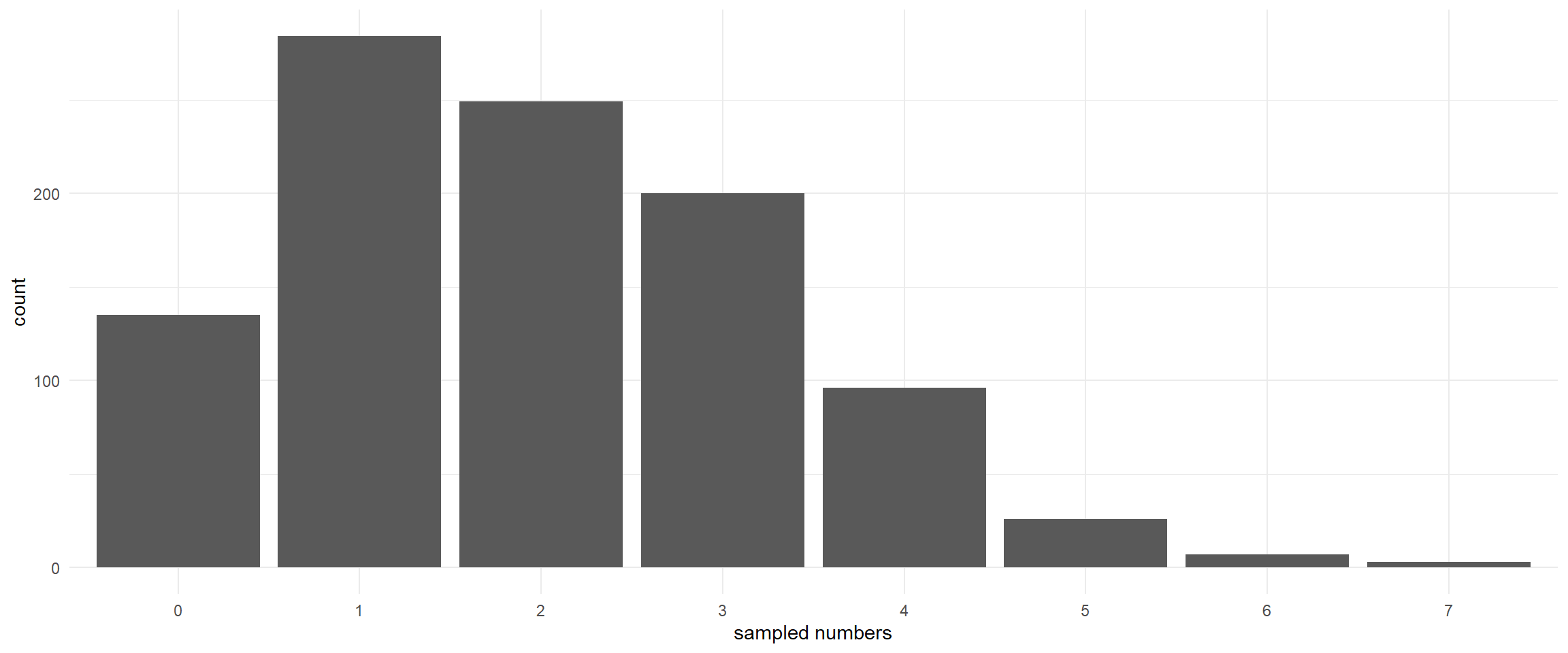 lambda <-2# Mean and variancepois_sample <-rpois(1000, lambda) # Random generation of Poisson distributionggplot(data.frame(pois_sample), aes(x =as.factor(pois_sample))) +geom_histogram(stat ="count") +theme_minimal()