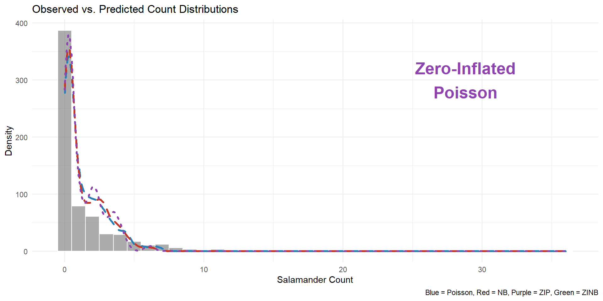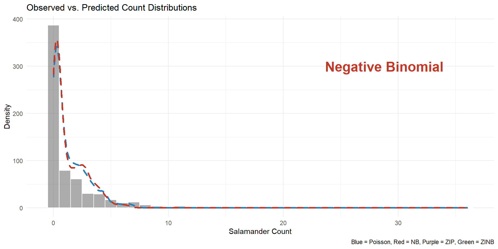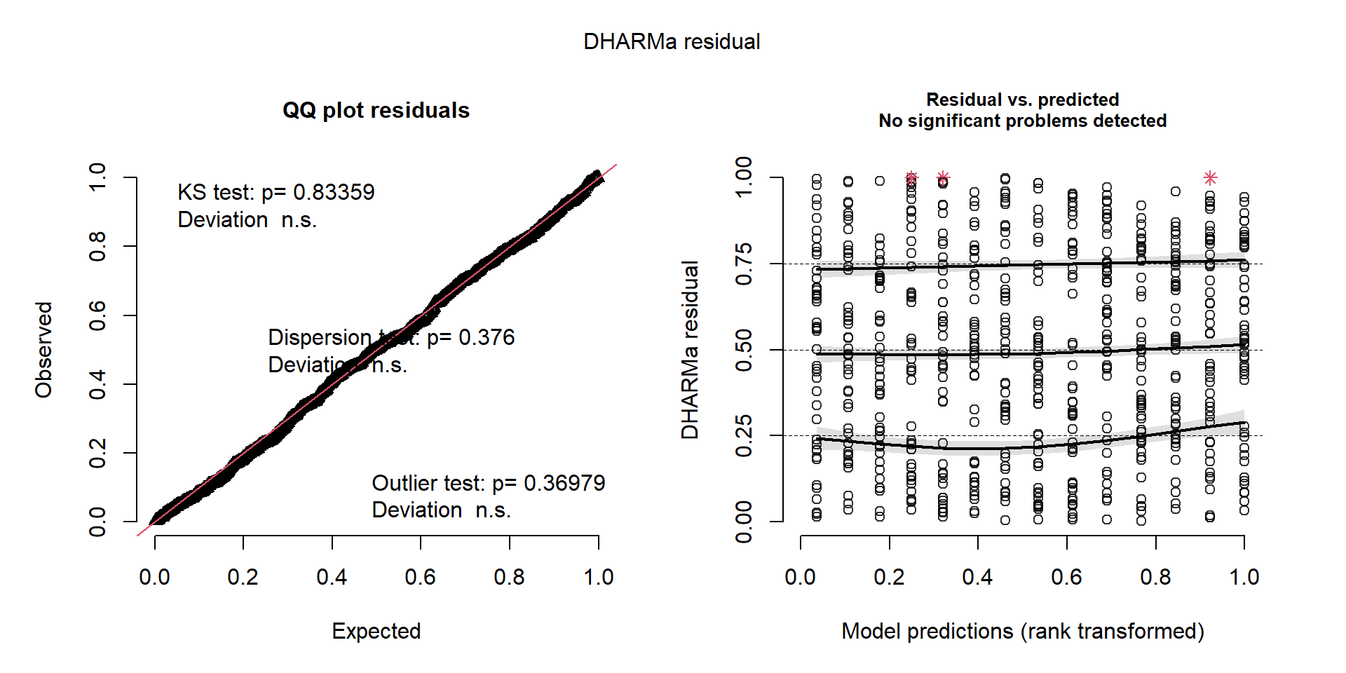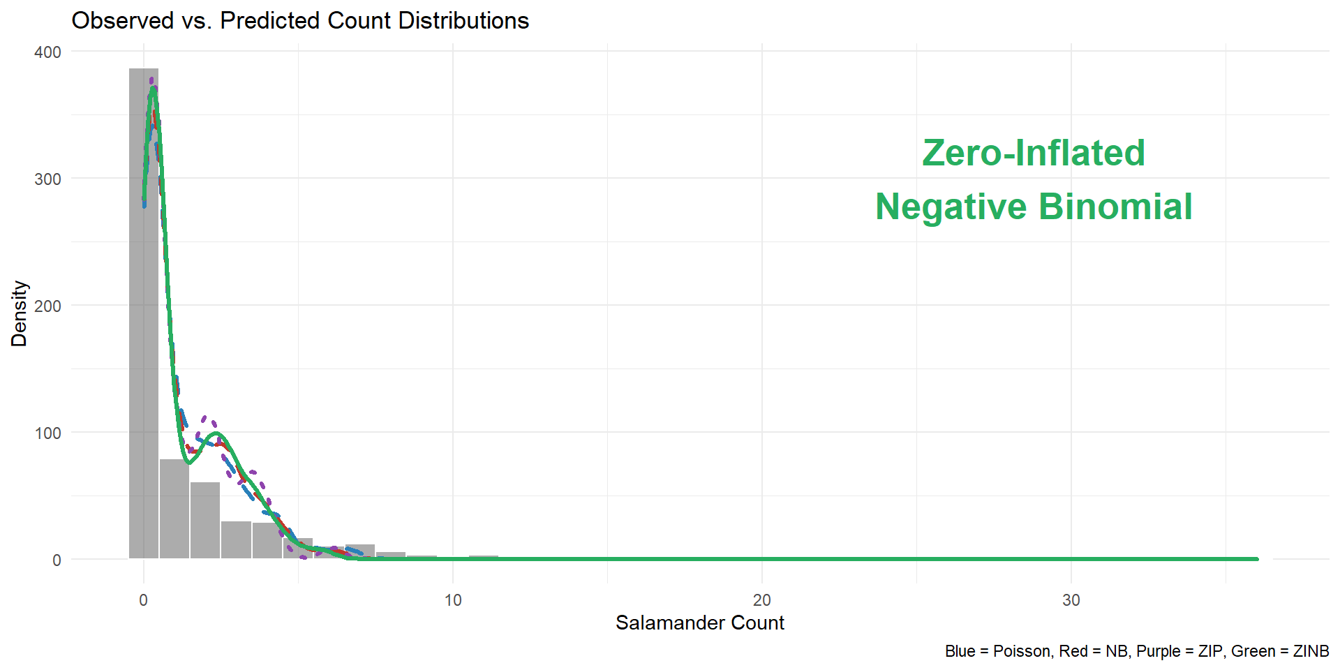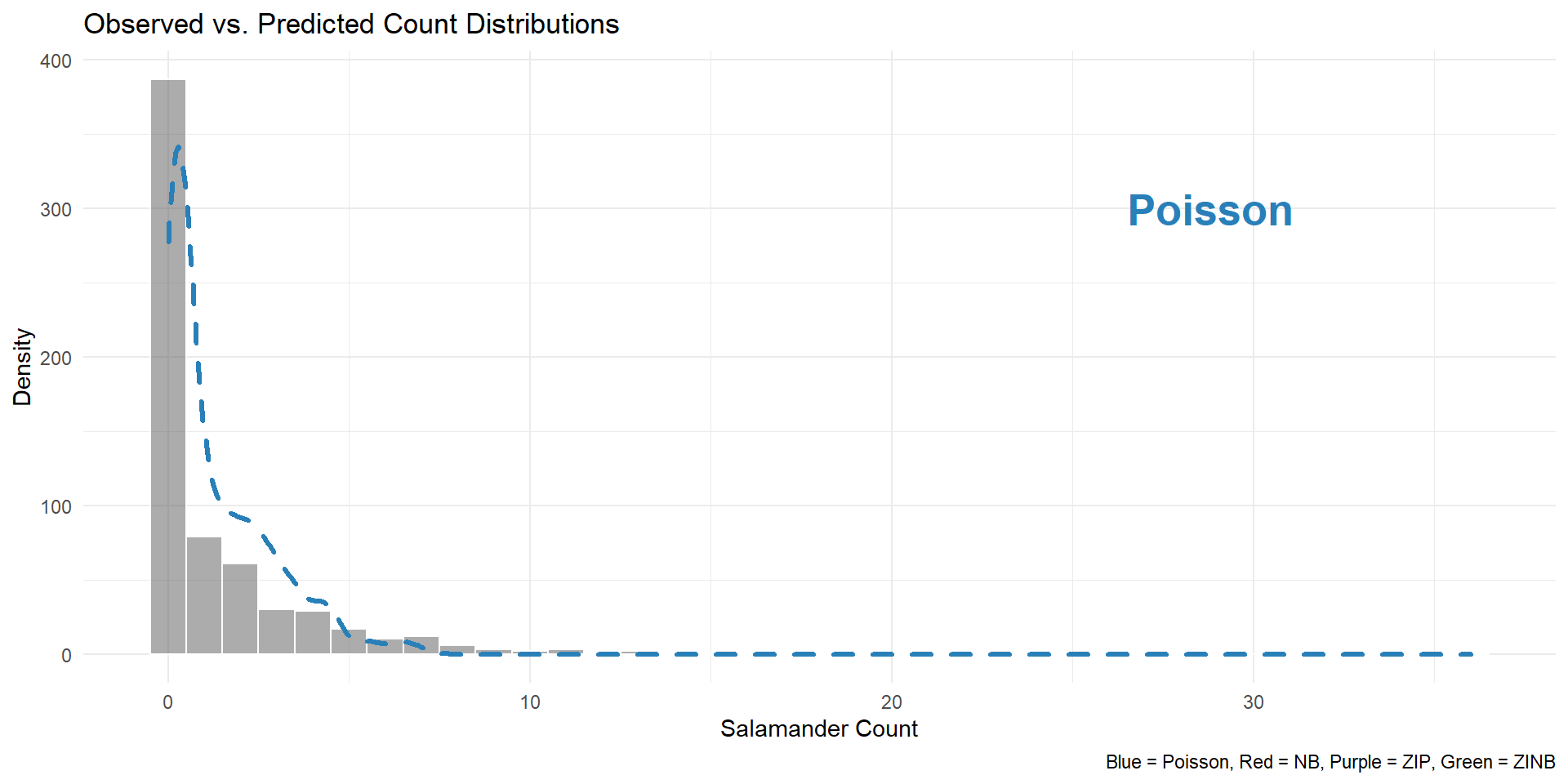 # Install if necessaryinstall.packages(c("glmmTMB", "ggplot2", "DHARMa"))# Load librarieslibrary(glmmTMB) # For modelinglibrary(ggplot2) # For visualizationslibrary(DHARMa) # For residual diagnosticsdata(Salamanders)str(Salamanders)